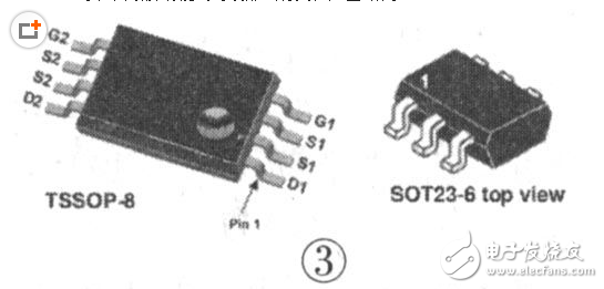 在该电路中,MOS开关管多采用薄型TSSOP -8或SOT23 -6封装形式,其外形如图3所示。这些MOS开关管有的内含一只N沟道场效应管,如FDMC7680,其①~③脚为S极,④脚为G极,⑤~⑧脚为D极,其内部结构如图4所示;有的内含两只N沟道场效应管,如FDW9926A、8205A等,其引脚功能与封装形式有关,如图5所示。