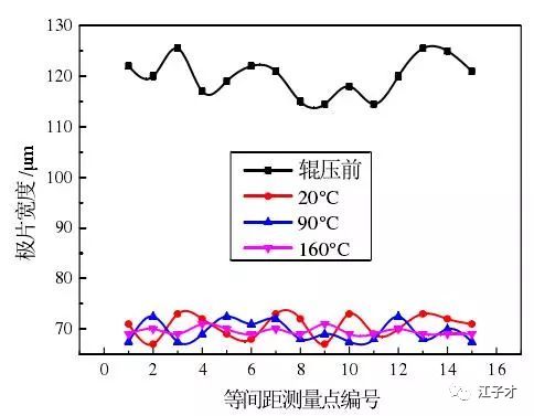 举个栗子,上图为涂敷厚度为 100 μm 的极片在不同轧制温度下的厚度曲线,如图所示:随着轧制温度由 20°C 增加为 90°C 再增加为160°C,极片厚度偏差由±1.9μm 降低为±1.3 μm 再降低为±0.8μm,极片厚度一致性逐渐提高,这是因为随着轧制温度的增加,极片涂层变形抗力减小,可塑性变好,使得极片表面厚度更加均匀。
