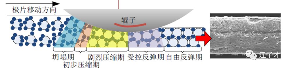 上一张老图,如上图:1塌陷期-2初步作用期-3剧烈作用期-4受控反弹期-5自由反弹期。反弹是一定的,但是反弹率我们希望在可接受的范围,并且稳定下来,使用辊压后烘烤(baking)可以加速极片的反弹并让其尽快稳定下来。