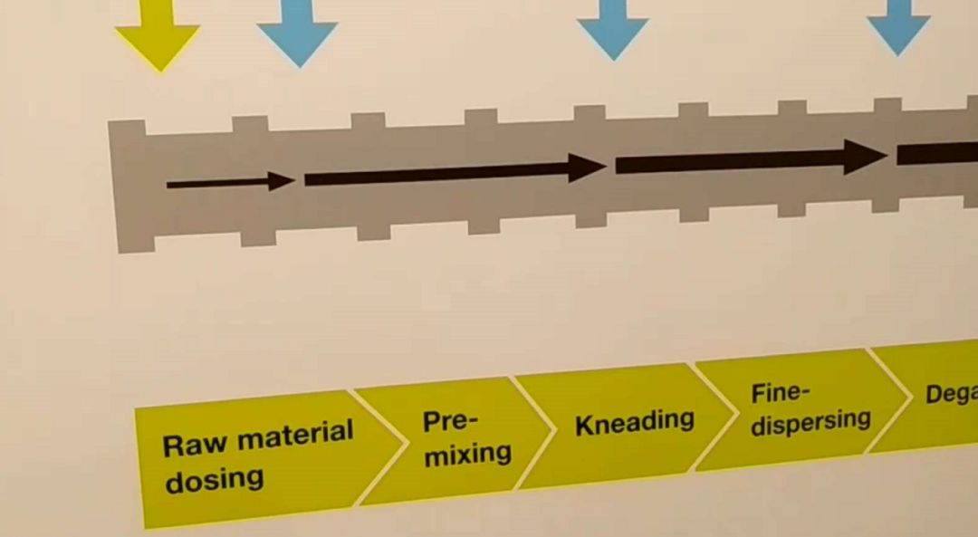 传统式混浆是批次式的方式,将浆料里的溶剂树脂一次性加到罐子里,进行搅拌,该产品是通过一排连续生产不同的点同时加入腔体,从入口到出口,物料停留时间2分钟,生产方式非常高效,双螺杆搅拌。