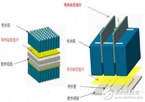 1、此类电池组空间大,与空气接触良好,裸露部分能通过空气自然换热,底部不能自然换热部位通过散热器散热,导热硅胶片填充散热器与电池组中间空隙,导热、减震、绝缘。
