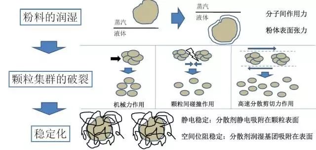 (1)粉料的润湿,将附着于粉体上的空气以液体介质取代。一种粉体要分散在液体中,首先必须被润湿,固体表面的湿润性由其化学组成和微观结构决定。固体表面自由能越大,越容易被液体湿润;反之亦然,润湿性可用接触角大小表示。(2)颗粒团聚体的破裂、分散,破碎团聚体主要有三种力:设备转动过程中的机械力,颗粒之间发生碰撞产生的作用力,高速分散剪切力。