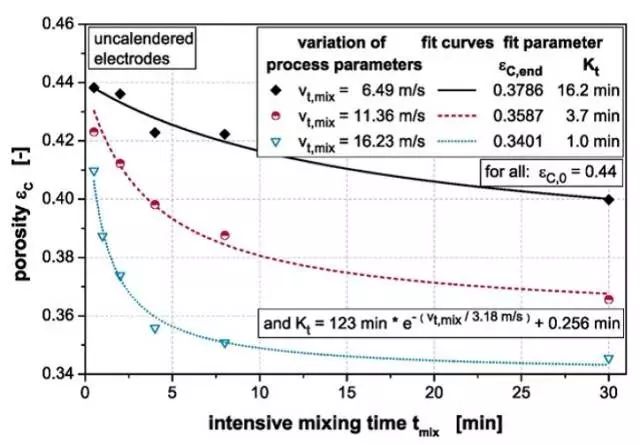 高强度的干粉分散混合主要的参数有:(1)高速分散的强度,可用弗鲁德数或转子线速度表示,(2)高速分散的时间。图6是高强度干粉混合对涂布极片孔隙率的影响,极片涂布之后未辊压,高强度干粉混合能够降低极片的孔隙率,转速一定时,随着分散时间越长,孔隙率越低,而分散时间一定时,转速越高孔隙率越低。