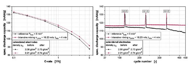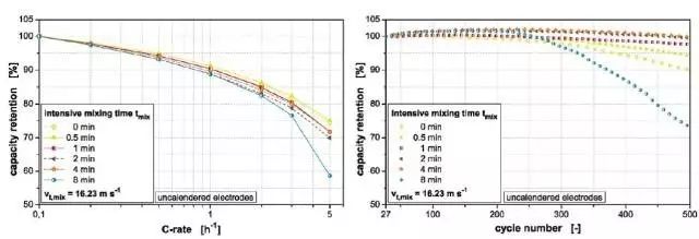 同样,高强度干粉分散混合,同样存在合适的工艺范围,在合适工艺范围内,极片和电池性能会提升,但是超出此范围,电池性能反而变差。