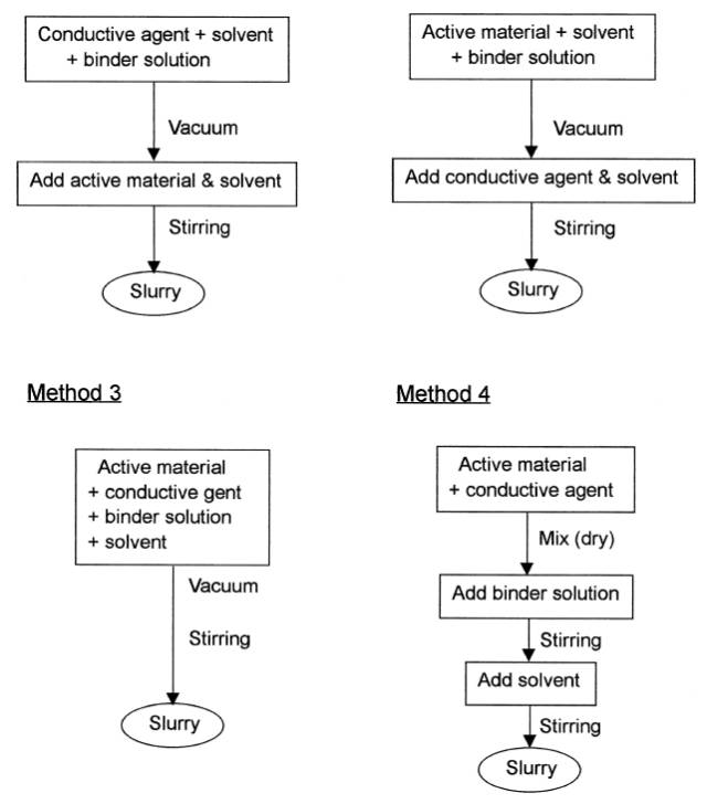 最开始锂电池浆料的制造借鉴涂料行业,1999年时,韩国人就开始了研究投料顺序对浆料性质和电池性能的影响。他们采取如图1所示四种投料工艺进行混料,采用相同的材料和配方,仅仅改变投料顺序就能改变浆料的性质。浆料的混合程度取决于颗粒大小,粒度分布,形状,比表面积,颗粒的溶剂吸收率等,从搅拌开始到粘度稳定所需的时间和依次加入的材料的比表面积最相关。