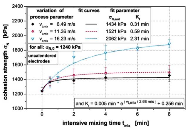 图7是高强度干粉混合对涂布极片结合强度的影响,极片涂布之后未辊压,高强度干粉混合能够提高极片的结合强度,转速一定时,随着分散时间越长,结合强度越高,而分散时间一定时,转速越高结合强度越高。