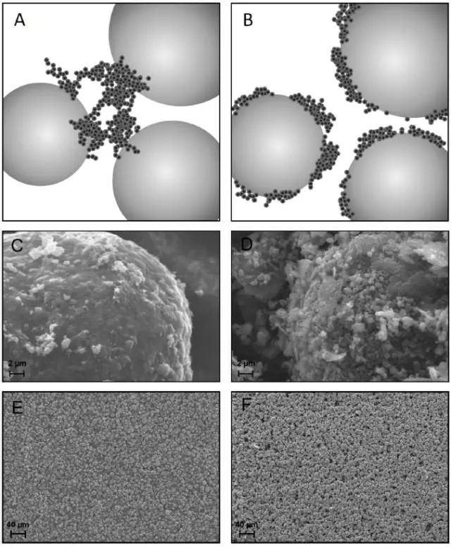 高强度的干粉剪切分散具有两个方面的作用:一方面,高的剪切力能够使导电剂团聚体充分破碎分散,另一方面,高速分散作用下,干粉搅拌能够实现微观上的混合,在较大的活物质颗粒表面沉积形成一层由细小的分散开的导电剂沉积层,从而形成良好的导电网络。如图5所示,一般的干粉混合强度低,导电剂没有完全分散开,在活物质颗粒表面仍旧存在团聚,而高强度干粉混合工艺使导电剂团聚体充分破碎分散,在活物质表面形成沉积层。
