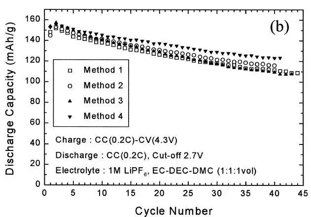 研究结果发现采用第4种工艺的浆料粘度达到稳定的时间可接受,而且所制备的浆料粘度最低,如表1所示,分散性最好,而且半电池循环测试结果表明此工艺制备的电池循放电容量衰减最小(图2所示)。