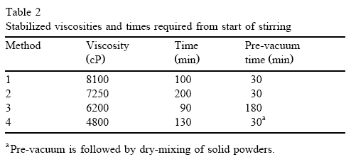 表1 四种混料方法浆料的稳定粘度和从开始搅拌到稳定所需时间