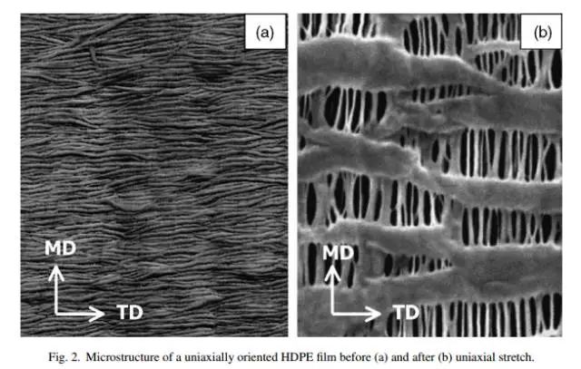 在拉伸工序,单向拉伸采用冷拉伸,沿MD方向,双向拉伸是在单向拉伸基础上采用热拉伸在TD方向。拉伸不仅可获取想获得的空隙结构(空隙尺寸及孔隙率),通过拉伸还能获得足够的拉伸强度。下图为单向拉伸隔膜前后对比图。