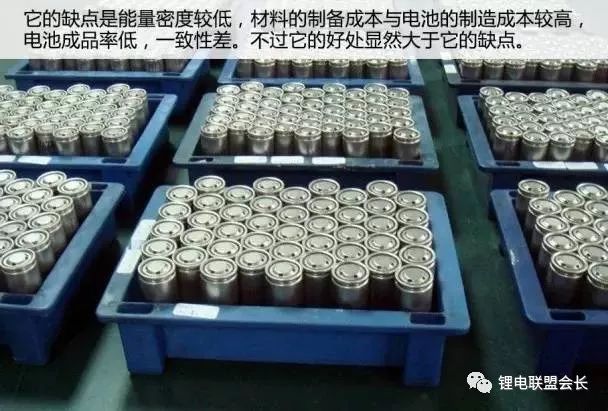 它的缺点是能量密度较低,材料的制备成本与电池的制造成本较高,电池成品率低,一致性差。不过它的好处显然大于它的缺点。