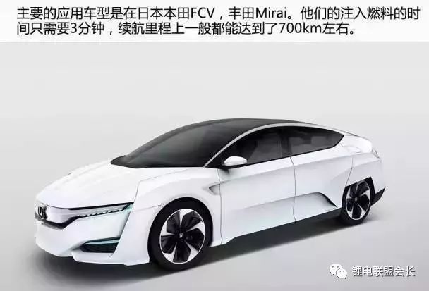 主要的应用车型是在日本本田FCV,丰田Mirai。他们的注入燃料的时间只需要3分钟,续航里程上一般能都达到了700km左右。现在的日本正在大力的扶持燃料电池,前景不错。