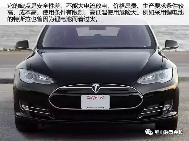 它的缺点是安全性差、不能大电流放电、价格昂贵、生产要求条件高、成本高、使用条件有限制、高低温使用危险大。例如采用锂电池的特斯拉也曾因为锂电池而着过火。