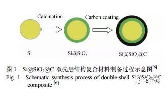 Tao等通过在硅纳米颗粒表面包覆SiO2和热解碳,制备出具有双壳层结构的复合材料(Si@SiO2@C),见图1。与单壳层Si@C相比,Si@SiO2@C具有更高的容量保持率,在0.01~5V电压范围内循环100次后仍具有785mA·h/g的可逆容量。