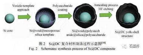 Sun等通过囊泡模板法制备出Si@void@SiO2材料,并在多孔SiO2壳层内外侧涂覆多糖,于惰性气氛下高温热解得到Si@void@C@SiO2@C,经HF刻蚀除去SiO2后,得到具有双壳层结构(Si@void@C@void@C)的蛋黄-壳型复合材料(Si@DC),见图2。