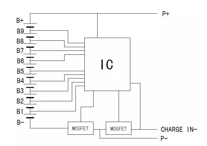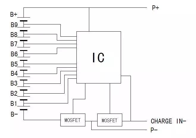 C、多节保护板与电池安装连接时,按照先低电平后高电平的顺序连接。即先连接B-,然后B1、B2......B9,最后B+。见下图。拆下保护板时,与安装顺序相反。