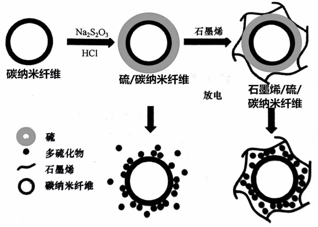 另外,考虑到石墨烯独特的二维片状纳米结构,采用以石墨烯纳米片作为包裹材料,构筑具有“核壳”结构的复合电极材料也是固定多硫化物,缓解其溶解的重要方式。先在碳纳米纤维表面均匀负载上硫,再使用石墨烯包覆在硫表面是一种很有效的方法。