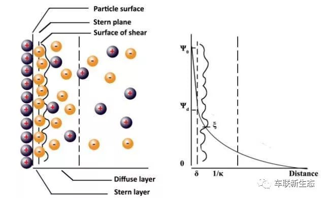 下图为Stern双电层模型,zeta电位(ξ,Zeta potential)为双电层模型中极重要的参数,实际测量时并无法直接测得粒子的表面电位,但可由声波法或是电泳法计算出粒子的zeta电位。双电层模型中Stern 层与扩散层间的剪切平面上存在zeta电位。
