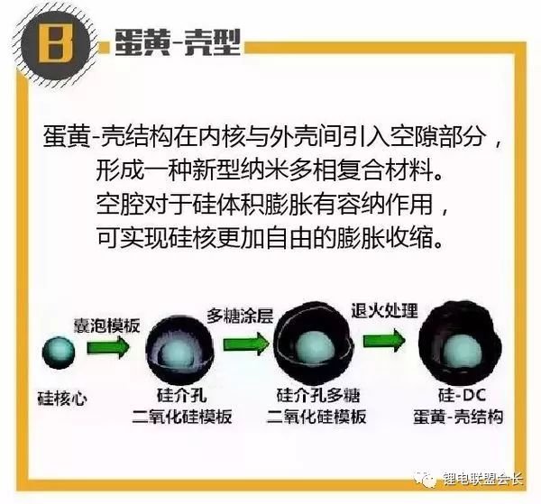 蛋黄-壳结构是在核壳结构基础上,通过一定技术手段,在内核与外壳间引入空隙部分,进而形成的一种新型纳米多相复合材料。蛋黄-壳型硅/碳复合材料呈现一种特殊的Si@void@C壳层的构型,不仅具有普通核壳结构的优势,而且它的空腔对于硅体积膨胀有容纳作用,可实现硅核更加自由的膨胀收缩,从而保证材料在充放电过程中整体结构的稳定性,有利于产生稳定的固态电解质(SEI)膜。