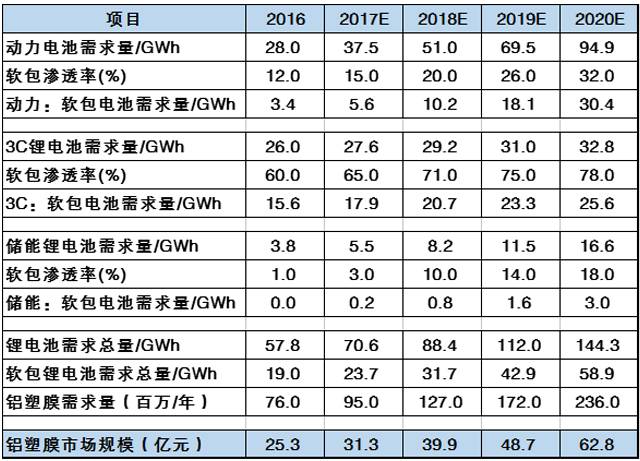 据统计,2017年-2020年的动力储能和3C软包锂电池需求,分别根据动力储能和3C不同类型的铝塑膜价格,计算得出2017-2020年我国铝塑膜需求为 0.95 亿平、1.27亿平、1.72亿平、2.36 亿平,对应市场空间为31亿元、39亿元、49亿元、63亿元,GAGR为26%。