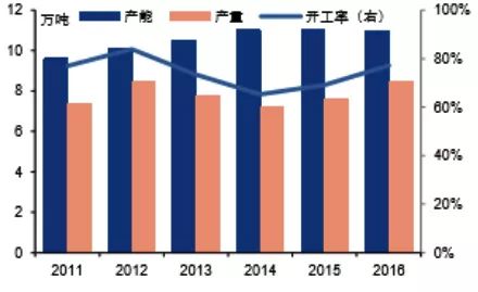 自2011年以来,我国BOPA产能从9.6万吨攀升至2016年的11万吨,年均复合增速为2.3%。BOPA产量则从2011年为7.39万吨上升至2016年的8.5万吨,特别是2016年由于产品价格上涨,BOPA产量迅速增长,行业开工率明显回升。
