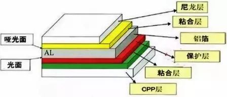 铝塑膜由外层尼龙层、粘合剂、中间层铝箔、粘合剂、内层热封层共五层组成,每层功能要求都比较高,表层ON层(尼龙层)为装饰性ON层,也起保护AL层不刮伤之作用;中间为形态成型和防止水分侵入的AL层;内层CPP(聚丙烯)层为耐电解液层。