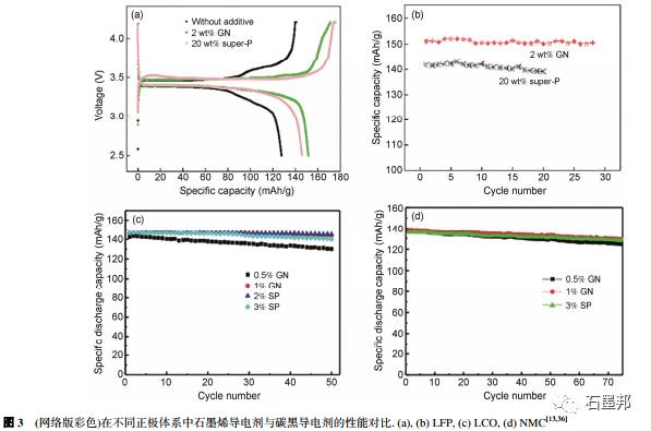 考虑到不同锂离子电池正极体系的特性有差别, 对于导电剂的需求量也不尽相同, 本课题组针对不同锂离子电池正极体系(包括LFP, LCO, NCM)系统考察了石墨烯导电剂在实验室工况下的最优使用量, 并与使用其他导电剂进行了对比, 探讨了基于“面- 点”接触模式石墨烯导电剂具有的优势.