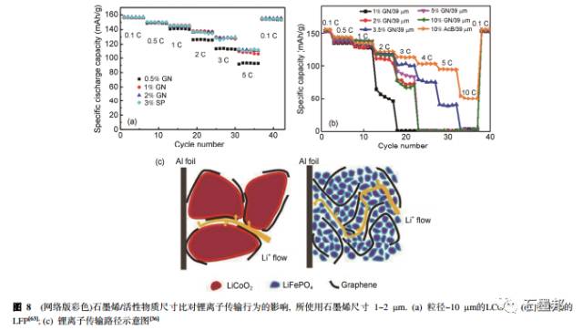 除了制备方法不同带来的影响外, 石墨烯片层的大小也会对导电效果产生影响. 从导电阈值理论上来讲, 片层大的石墨烯更容易在电极内部产生导电网络.所以,一般认为在相同电化学性能条件下,片层尺寸较大的石墨烯导电剂用量应该更少.然而Wu课题组发现结果并非如此, 使用片径5um以下 的石墨烯导电剂时LFP表现出较好的性能, 5 C放电时LFP的比容量分别为112和104 mAh/g. 但是相同添加量的10um以上石墨烯导电剂效果反而变差,只有79 mAh/g. 这表明对于片层很大的石墨烯导电剂, 影响LFP电化学性能的因素不再仅仅是电子传导, 还需要考虑离子传输问题.