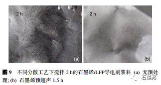 将石墨烯导电剂进行超声预处理,可以显著提高石墨烯导电剂的分散效果. 如图9所示,如果没有对石墨烯作任何预处理,仅通过行星式真空搅拌机搅拌分散2h后,浆料表面仍然可以观察到非常明显的石墨烯团聚块, 证明石墨烯并没有很好地分散在正极体系中.如果预先将石墨烯放置在N-甲基吡咯 烷酮(NMP)中强超声处理1.5h之后再进行搅拌, 2h后发现相较于未经任何处理的情况, 石墨烯可以很好地分散在浆料里.