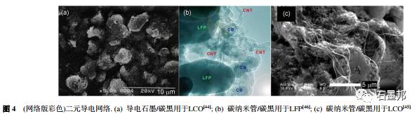 在电极内部构建导电网络时, 如果能够综合利用石墨烯与碳黑的“面-点”和“点-点”接触模式, 可以在使用更少石墨烯的前提下进一步提高正极活性材料的性能发挥.事实上,在实际锂离子电池制备过程中, 为了综合利用不同导电剂的优势,在更大程度上综合提高电池性能,也往往将两种不同导电材料(导电碳黑与导电石墨或碳纳米管)组成二元导电剂使用,在电极的不同尺度上同时建立导电网络.如Kim课题组将碳黑与导电石墨作为LCO的导电剂; Fan课题组将碳黑与碳纳米管引入到LCO体系; Sotowa等人将碳黑与碳纳米管用于LFP体系等(图4). 由于不同尺度的导电剂可以分别从电极的不同层次上构建协同导电网络,所以效果 优于单一导电剂的情形.
