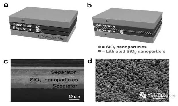 上述的几种隔膜主要功能是通过对电解液进行净化,从而达到提升锂离子电池性能的目的,在锂离子电池使用中我们非常关注的另外一点就是锂离子电池的安全性,特别是三星发生Note7手机爆炸事故后,我们对锂离子电池的安全性问题也更加关注。锂枝晶问题是引起锂离子电池安全性降低的一个重要原因,导致锂离子电池锂枝晶产生的原因很多,例如N/P比不合理,低温充电和大倍率充电等都可能导致负极锂枝晶问题。锂枝晶产生后,可能会穿透隔膜,引起正负极短路,因此在锂离子电池的使用过程中要尽可能的避免锂枝晶产生。斯坦福大学的KaiLiu 等人为了解决锂枝晶的问题,设计一款具有三层复合结构的多功能隔膜【4】。该隔膜由两层聚合物隔膜中间夹着一层纳米SiO2颗粒构成,当锂枝晶生长到穿入隔膜时,会与SiO2颗粒接触,并与之反应,Li枝晶被消耗,从而避免了Li枝晶穿透隔膜,导致正负极短路。作为一种主动安全隔膜,该隔膜能够与锂枝晶及时发生反应,避免Li枝晶穿透隔膜引发短路,提升锂离子电池的安全性和循环寿命。
