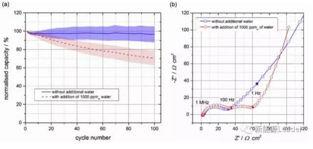 造成正极材料中的过渡金属元素的溶解、电池性能下降等问题的很重要的一个原因就是电解液中分解产生的HF,电解液中的HF主要是因为LiPF6分解导致的。LiPF6在电解液中会发生分解LiPF6=LiF+PF5,在电解液中有水存在的前提下,PF5会进一步发生分解PF5+H2O=2HF+PF3O,上述反应产生的HF和路易斯酸(PF5、PF3O等)会引发锂离子电池内的副反应,导致电池性能下降,例如研究显示在LiFePO4/石墨电池中添加1000ppm的水分就会导致电池的循环寿命出现显著的下降,寿命不足50次,EIS测试表明在给电池中增加水分后会导致电池内阻明显的增加,这说明额外的水分是引起电解液中LiPF6发生分解,产生的HF和路易斯酸会在电池内引发副反应,从而使的锂离子电池生成高阻抗的SEI膜,影响锂离子电池的寿命【2】。