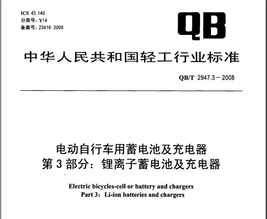 目前,市面上电动自行车用蓄电池执行的行业标准为:国标GB/T22199-2008(电动助力车用密封铅酸蓄电池)、行标QB/T2947.3-2008(电动自行车用蓄电池及充电器第3部分:锂离子蓄电池及充电器),锂离子蓄电池的还没有制定相应的国家标准。