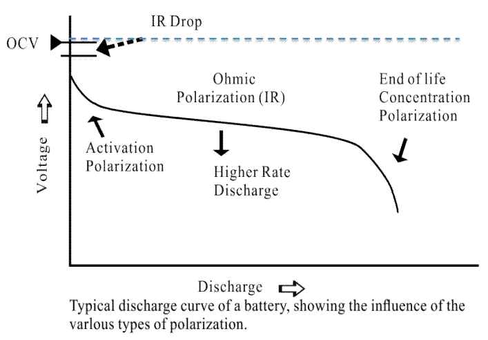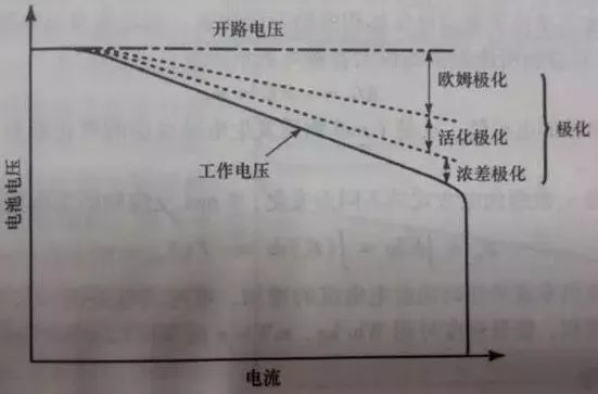 电流通过电极时,电极偏离平衡电极电势的现象称为极化,极化产生过电势。根据极化产生的原因可以将极化分为欧姆极化、浓差极化和电化学极化,图2是电池典型的放电曲线及各种极化对电压的影响。