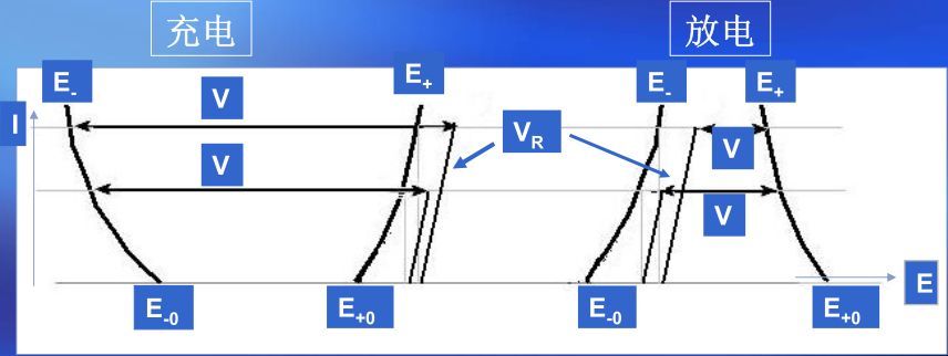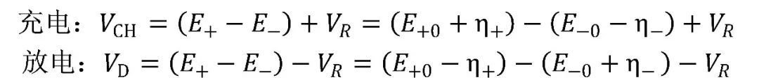 其中,E+、E—分别表示正、负极的电势,E+0、E—0分别表示正、负极的平衡电极电势,VR表示欧姆极化电压,η+、η—分别表示正、负极的过电势。