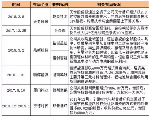 从行业来看,早在2013年,宁德时代就已经并购了邦普;2017年厦门钨业收购了赣州豪鹏;2018年并购的案例更多一点。