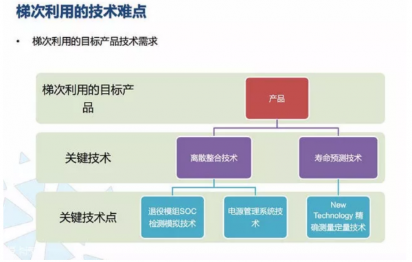 梯次利用的流程可以分为三步:先对回收的电池进行筛选,然后进行电池的串并联,第三步进行充放电的管理,外加入BMS,设计容量和功率的匹配。一般电池容量与功率的匹配比为8:1,放电倍率在0.125C。