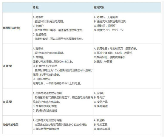 公司镍电池从容量上区分,从100mAh至15000mAh不等。通常使用的有标准型、消费型、高温型和大电流放电型等四大类,可应用于任何无线设备。