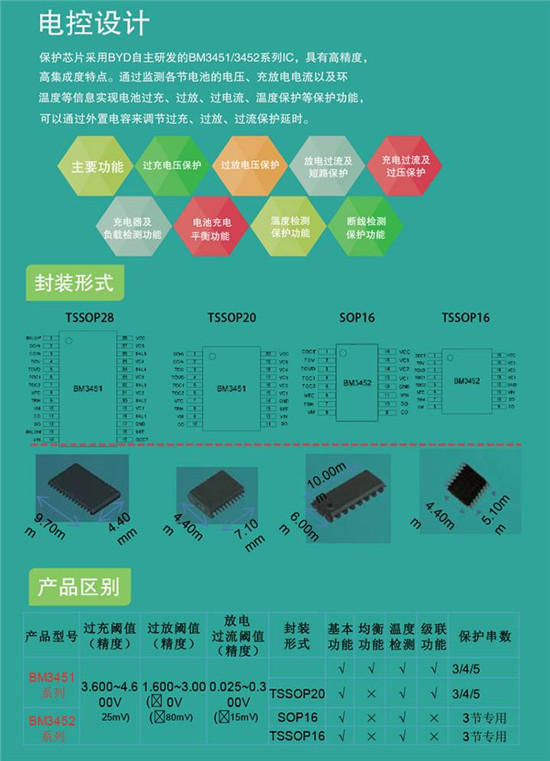 电控设计方面,比亚迪提供了BYD自主研发的BM3451/3452系列IC,两者具有高精度、高集成度等特点。通过监测各节电池的电压、充放电电流以及环温度等信息实现电池过充、过放、过电流、温度保护等保护功能,可以通过外置电容来调节过充、过放、过流保护延时。另外,BM3451/3452系列可采用多种封装形式,为客户提供定制化芯片尺寸。