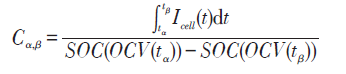 式中,任意两个时刻(α ,β)的SOC 由OCV 查表得到,该方法可在实际中应用,可以取若干个点,两两搭配计算出多个容量值,再取平均值或中位数。这种方法比较简单,但关键在于OCV 能否精确辨识。