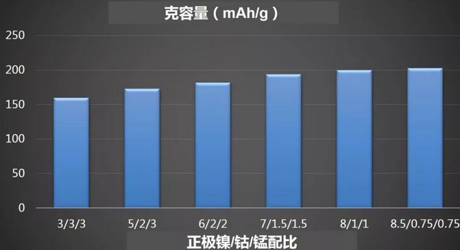 在图5中几种典型三元材料中可以看出,镍的占比越来越高,钴的占比越来越低。镍的含量越高,意味着电芯的比容量就越高。另外,由于钴资源稀缺,提高镍的比例,将降低的降低钴的使用量。