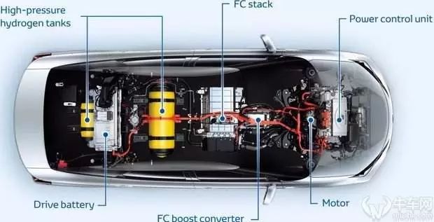 燃料电池发出的电,经逆变器、控制器等装置,给电动机供电,再经传动系统、驱动桥等带动车轮转动,就可使车辆在路上行驶。与传统汽车相比,燃料电池车能量转化效率高达60~80%,为内燃机的2~3倍。