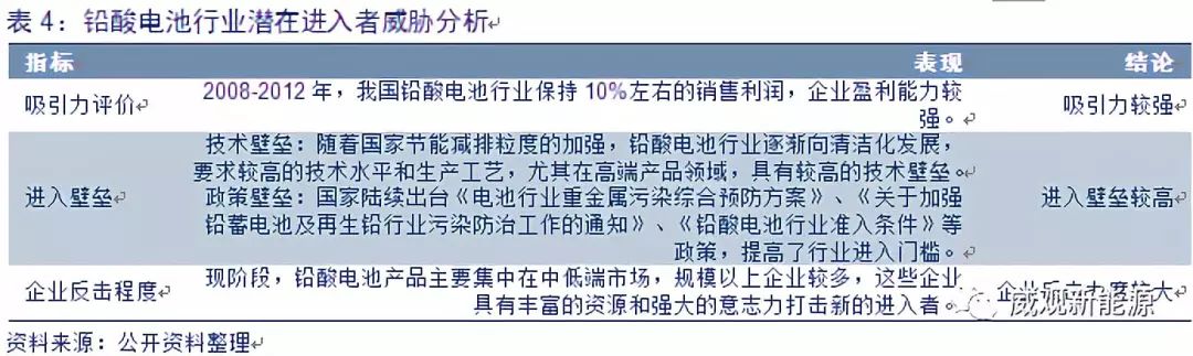 替代品的威胁:目前市场上主要充电电池有镍氢电池、铅蓄电池和锂离子电池,其中锂离子电池对铅酸电池具有很强的竞争性。在锂电池和铅酸蓄电池的属性对比中,两种不同类型的电池各具优势。铅酸蓄电池最大的优势就是适用温度带很宽。在低温环境中放电功能良好,在高温环境中本体不会发生爆炸,安全性能高。它的另一个较大的优势则是售价低廉,这得益于它丰富的原料以及高资源循环率。反观锂电池,它的优势在于电池能量密度高,这可以让它需要高续航能力的新能源汽车领域打开市场。此外,国家出台的相关政策也支持锂离子电池的发展。