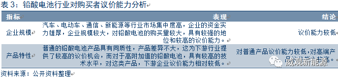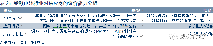 供应商的议价能力:铅酸蓄电池行业的上游包括铅、硫酸、塑料等,铅酸蓄电池行业对原材料的需求量大,铅和硫酸行业整体呈现产能过剩,且电池制造是铅的重要下游应用领域,从而铅酸蓄电池行业对铅和硫酸具有较强的议价能力,而塑料供不应求,且行业对塑料的特性有较高的要求,从而对塑料行业议价能力较低。