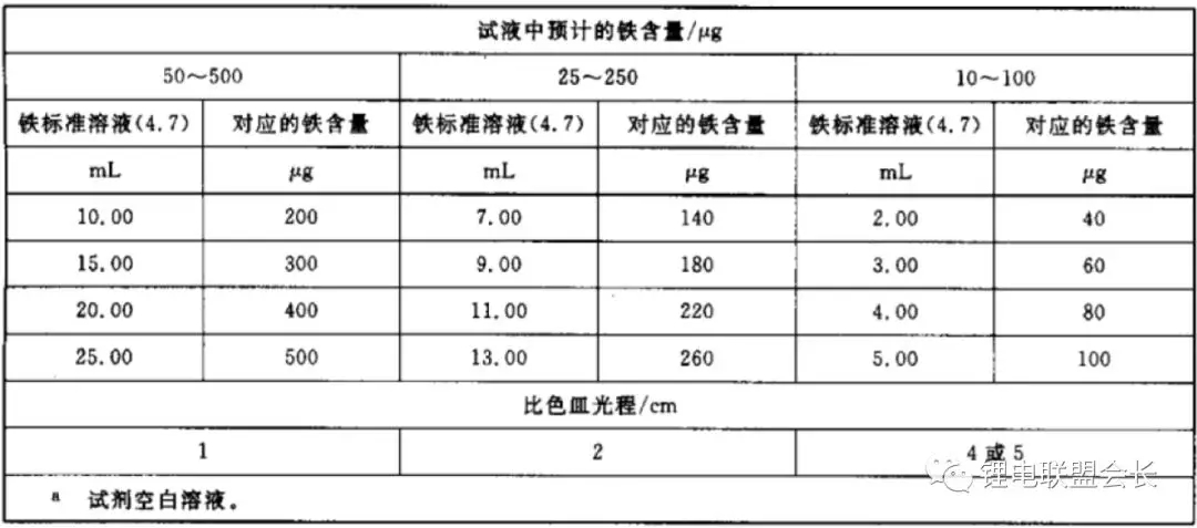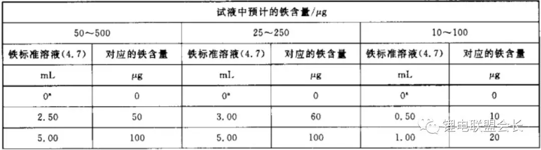 在电解液的配置以及管道运输过程中,不可避免的引入了铁杂质,从而引起锂离子电池的性能衰减,一般采用GB/T3049化工产品中铁含量测定通用方法邻菲啰啉分光光度法进行测量,其原理为用抗坏血酸将三价铁离子还原成二价铁离子,在pH为2-9时,二价铁离子与邻菲啰啉生成橙红色络合物,在分光光度计最大吸收波长(510nm)处测定其吸光度,由显色后的吸光度值从标准曲线中查的待测液体和空白实验中的铁含量。