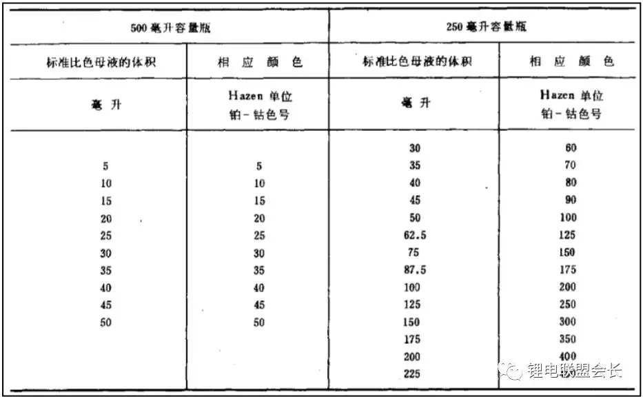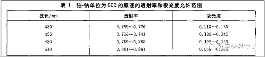 观察电解液的颜色,一般电解液都为无色透明的液体,也有专门的国标对外观的检测有具体的方法,标准为GB/T9282.1-2008透明液体以铂-钴等级评定颜色第部分通过配置铂-钴标准溶液,并用分光光度计在不同入射光波长范围下测量其吸光度值和透射率,然后配置一系列的标准比色溶液,在一系列的100ml比色管中加入指定体积的原液,用水稀释到刻度并摇匀,然后封住,并在比色管上标明相应的钴-铂单位数,然后用待测的样品和标准样品比较即可。