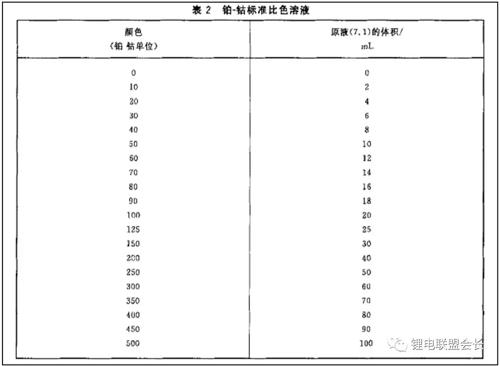 观察电解液的颜色,一般电解液都为无色透明的液体,锂电池也有专门的国标对外观的检测有具体的方法,标准为GB/T9282.1-2008透明液体以铂-钴等级评定颜色第部分通过配置铂-钴标准溶液,并用分光光度计在不同入射光波长范围下测量其吸光度值和透射率,然后配置一系列的标准比色溶液,在一系列的100ml比色管中加入指定体积的原液,用水稀释到刻度并摇匀,然后封住,并在比色管上标明相应的钴-铂单位数,然后用待测的样品和标准样品比较即可。