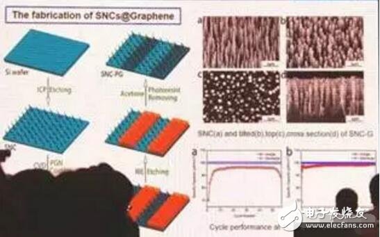 石墨表面因为导电性特别好,相对来说SEI膜比较均匀,它的组成跟硅负极不一样。为了研究这个问题,中科院相关科学家做了模型材料,通过微加工做成硅纳米柱。观察这种材料在充放电过程中SEI膜的生长,我们发现随着循环次数的增加,SEI膜逐渐把硅柱中间的空隙填上,覆盖完后还会继续生长大概4.5μm,在硅表面如果不加任何处理,SEI膜可以长得很厚。这说明它是多孔的,溶剂始终能够接触到浸到硅的表面,这样在全电池设计时是不行的。怎么样解决这个问题,中科院科相关学家做了一些尝试在硅上做了碳包覆,为了做对比,我们硅上只做了部分的石墨烯包覆,其他地方空出来。最终看到包覆和不包覆SEI膜的生长情况不一样,碳包覆的SEI膜就明显减少,没有包覆的SEI膜就有很多。