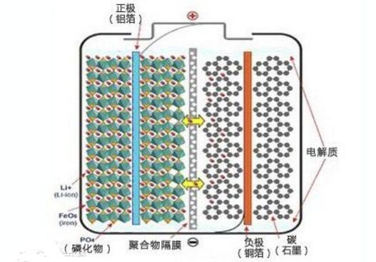 LiFePO4电池在充电时,正极中的锂离子Li+通过聚合物隔膜向负极迁移;在放电过程中,负极中的锂离子Li+通过隔膜向正极迁移。锂离子电池就是因锂离子在充放电时来回迁移而命名的。