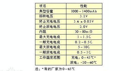 LiFePO4电池的标称电压是3.2V、终止充电电压是3.6V、终止放电压是2.0V。由于各个生产厂家采用的正、负极材料、电解质材料的质量及工艺不同,其性能上会有些差异。例如同一种型号(同一种封装的标准电池),其电池的容量有较大差别(10%~20%)。